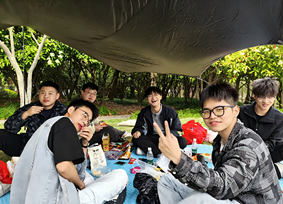 在湖边开阔的草地上,大家齐心协力搭起天幕,从搬运装备到固定绳索,人人动手、各显其能,很快便在绿意盎然间开辟出一方专属的欢乐天地。远离了实验室的忙碌,每个人都卸下疲惫,全身心投入到难得的休闲时光中。